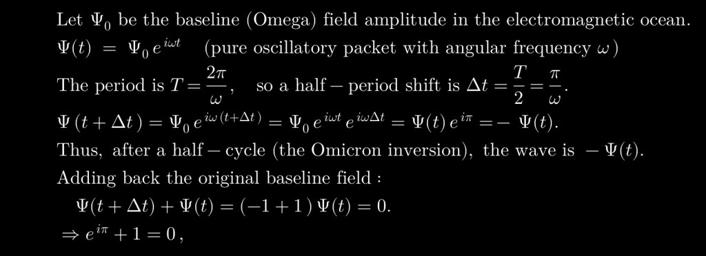 becomes a statement about how a pure oscillatory “packet” in the electromagnetic ocean undergoes a half-cycle phase inversion and then coherently annihilates itself. Here, e reflects the intrinsic exponential amplification of a field disturbance, i encodes a quarter-turn phase rotation in the medium, and π corresponds to half a full oscillatory period. Sending that disturbance through an iπ phase shift is like driving a vortex cavity from maximal constructive coherence into exact destructive anti-coherence—in other words, from Omega (mass-like stasis) to its Omicron opposite (divergent inversion). When you then “add one” – the original undisturbed field baseline – the inverted wave precisely cancels it, yielding zero. Thus, eⁱᵖⁱ + 1 = 0 is nothing other than the ocean’s own signature of perfect phase conservation and cancellation, a dynamic closed-loop in which divergence and coherence entwine to erase themselves.