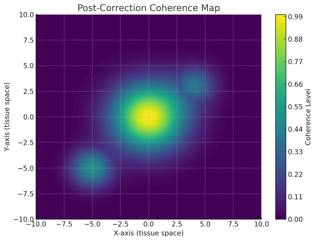 • The darker zones in the top left and bottom right corners represent local decoherence—disruptions in the wavefield, possibly corresponding to injury, inflammation, or neural misfiring.
