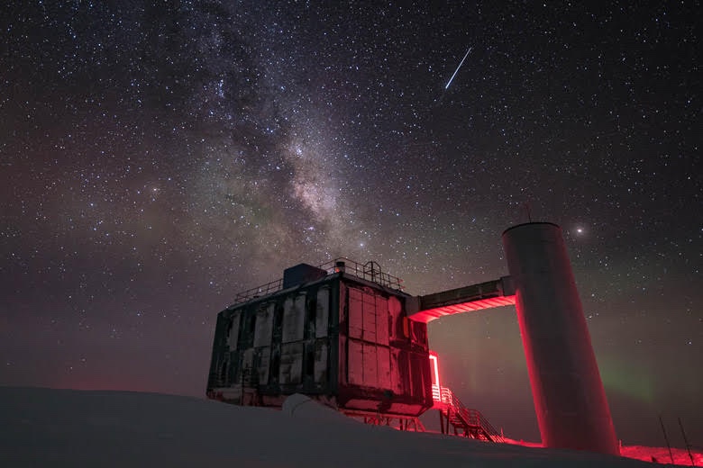 At the South Pole, the IceCube Neutrino Observatory turns a cubic kilometre of crystal-clear Antarctic ice into a gigantic three-dimensional net of light sensors, waiting for the faint blue glow that appears when a high-energy neutrino streaks through and outruns light in the ice. Each sensor records the flash with nanosecond precision, so when a distant cosmic explosion—like a gamma-ray burst or a magnetar flare—fires both neutrinos and a burst of gamma-ray light toward Earth, IceCube can time the neutrinos almost to the heartbeat, while orbiting satellites time the photons. By lining up those two cosmic stop-watches, scientists can check whether the photons arrive a microsecond later than expected, the hallmark of the tiny “drag” our electromagnetic-ocean model predicts for light but not for neutrinos as they cross interstellar space. In other words, IceCube is a colossal frozen telescope whose split-second timing lets us test whether space itself tugs slightly harder on light waves than on neutrino waves.