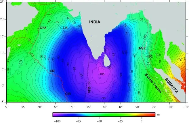 The Indian Ocean Geoid Low (IOGL) is one of the most enigmatic and extreme gravitational anomalies on Earth. Discovered through satellite geodesy (especially by the GRACE and GOCE missions), it refers to a massive region—roughly centered 1,200 km southwest of the southern tip of India—where the geoid dips by up to 106 meters below the global average. That is, the gravitational potential there is unusually low, causing the “mean sea level” surface (as measured by satellite) to sag significantly. It’s the deepest known geoid depression on the planet.