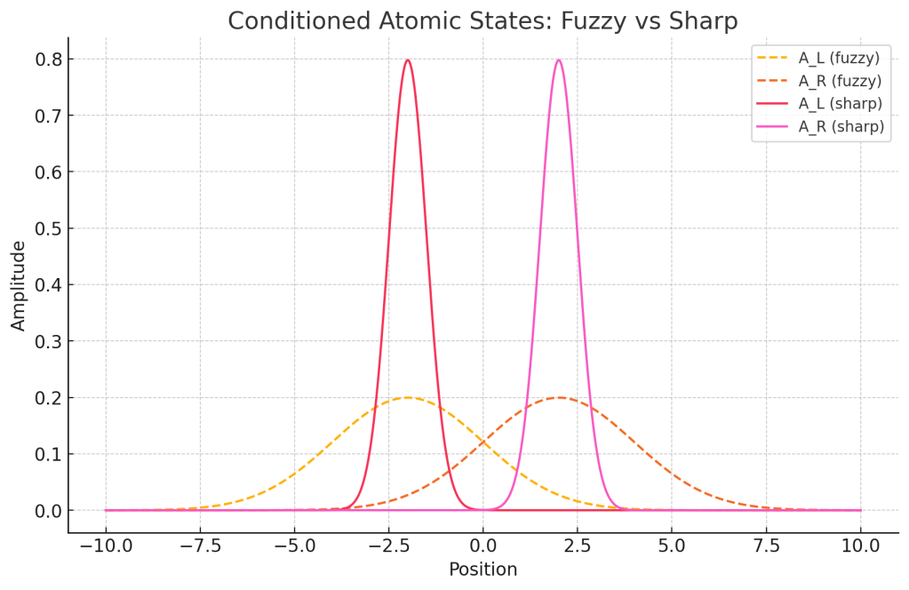 • The dashed curves represent the “fuzzy” atomic states: their spatial uncertainty is wide, so the left and right conditioned wavefunctions overlap significantly. The computed overlap is ≈ 0.052, meaning the system retains enough coherence for some interference to survive.
