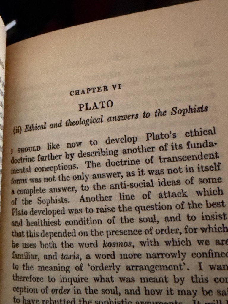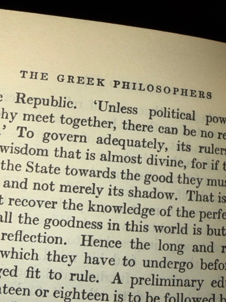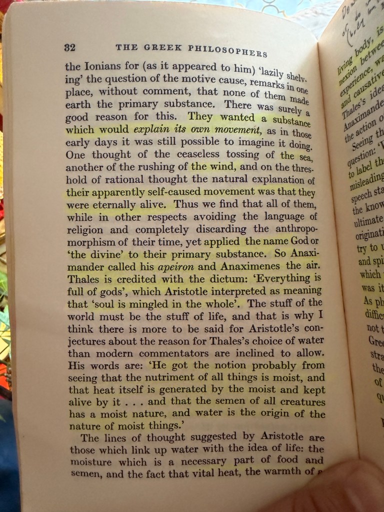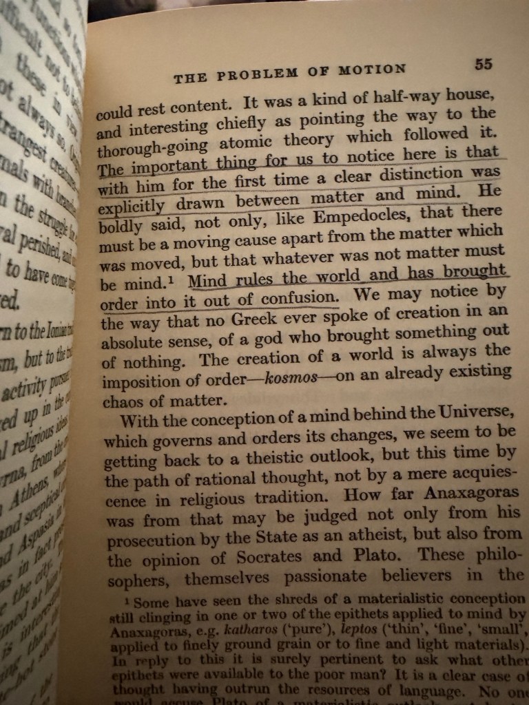 But as the pages progress, a decisive split occurs. Anaxagoras draws “for the first time a clear distinction between matter and mind.” From this moment, nous—mind—becomes the organizing principle, “bringing order out of confusion.” The world that once moved of its own accord now requires a ruler. Motion ceases to be life and becomes command. This is the beginning of metaphysical hierarchy: logos mastering physis.