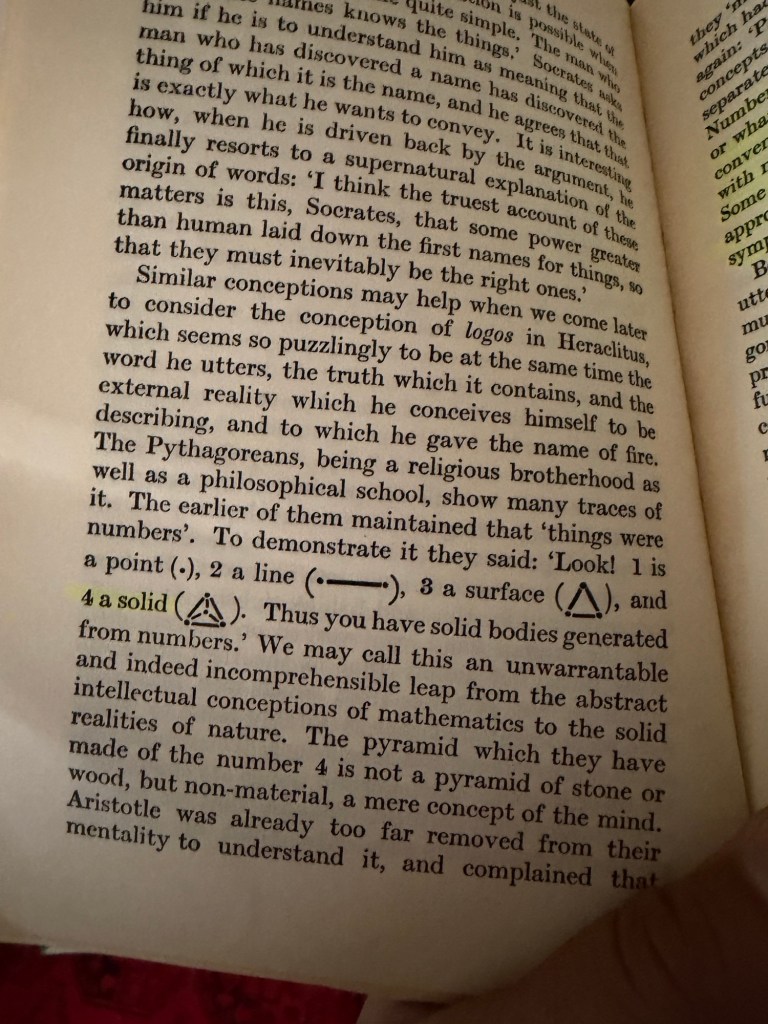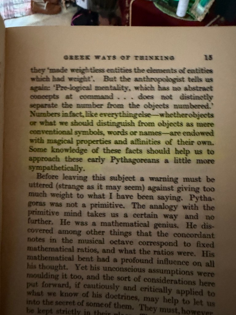 The highlighted passage reminds us that early consciousness, what the author calls “pre-logical mentality,” did not distinctly separate the number from the objects numbered. Number was not an abstraction; it was the thing’s potency, its living ratio. To count something was to participate in its being, not to measure it from without. The Pythagoreans stood exactly at that hinge. When they spoke of number, they still felt its magical property — its vibratory power to bind form and soul — yet they also, for the first time, began to treat it as something that could be abstracted.