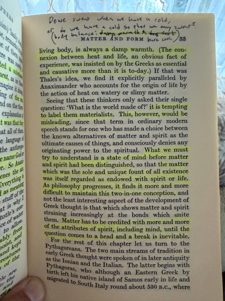 You can feel in these pages how the early unity of damp warmth—the living continuum between heat and life—is gradually abstracted upward until the “mind that rules the world” stands above its own creation. What had been one becomes two, and what was self-caused becomes ruled.